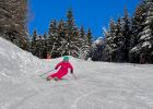 Nějaký ten sluneční paprsek ráno dopadá také na začátek červené sjezdovky č. 2 Kogelabfahrt, která nás baví hlavně úvodní širší planinkou a následným pravotočivým padákem, který je prudký akorát tak, abyste to mohli pokládat na hrany. Pak se sjezdovka zúží a následně se napojí na modrou Rodinnou sjezdovku, která už jen na kousku nechá lyže trochu carvovat načež je po cestě dovede k dojezdu svěťákové sjezdovky.