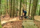 Na červeném trailu najdete i jedinou černě značenou pasáž, která zahrnuje kamenité pasáže a jednu ikonickou skalku, která se dá označit za takový klasický fotospot Tanvadlského Špičáku. Kameny jsou tu ale docela příjemně vyskládané, takže místy tu trail připomíná vydlážděný chodník a kromě dvou prudších úseků tu není nic příliš náročného. Začátečníkům ale doporučuji tuhle pasáž objet.